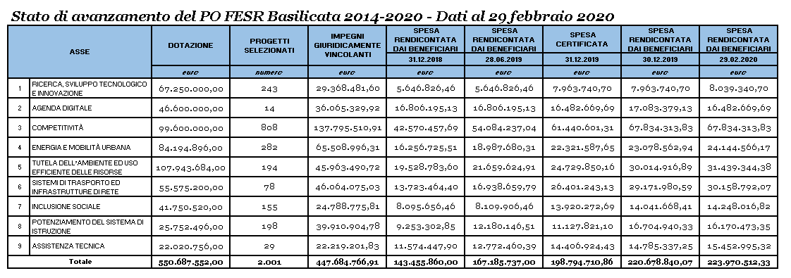 Stato di avanzamento del PO FESR al 29 febbraio 2020